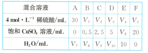 (2)①因为要研究CuSO₄的量对氢气生成速率的影响,所以应保持硫酸溶液的浓度在各组实验中相同,则稀硫酸的体积均取30mL,即V₁=30,根据混合溶液F中加入的水与硫酸铜溶液的体积之和为20mL,可以求得V₆=10,V₇=20,V₈=19.5,V₉=17.5,V₁₀=15。