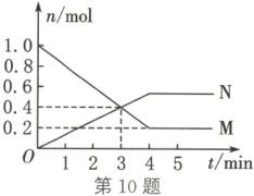 10.B 解析:由图示可知,3min时,M的物质的量减少1.0mol-0.4mol=0.6mol,N的物质的量增加0.4mol-0=0.4mol,则M为反应物,N为生成物,达到平衡时M、N的物质的量均不为0,反应为可逆反应,而物质的量变化量之比等于化学计量数之比,则反应的化学方程式为$3M\rightleftharpoons2N$,A正确;3min后,M继续减少,N继续增多,说明3min时反应正向进行,此时$v_正>v_逆>0$,B错误;通过控制反应条件可改变可逆反应的限度,C正确;4min时各物质的物质的量不再变化,反应达到平衡,0~4min内,M消耗1.0mol-0.2mol=0.8mol,则N生成$\frac{1.6}{3}mol$,$v(N)=\frac{\frac{1.6}{3}mol}{V·\Delta t}=\frac{1.6}{2L×4min}mol\approx0.067mol·L^{-1}·min^{-1}$,D正确。