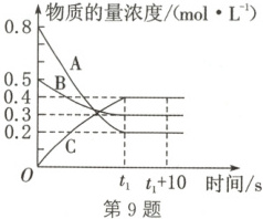 9. 一定温度下,在恒容密闭容器中,$ A$气体与$ B$气体反应生成$ C$气体。反应过程中,反应物与生成物的浓度随时间变化的曲线如图所示。