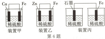 6.D 解析:装置乙中Zn的活动性比Fe强,Zn作负极,Fe作正极,正极上氢离子得电子生成氢气,装置乙中铁片上有气泡产生,A错误;装置丙中,未形成闭合回路,不能构成原电池,B错误;装置甲中Fe作负极,失电子生成Fe²⁺,铁片质量减小,装置乙中Fe作正极被保护,铁片质量不变,装置丙中发生普通化学反应,铁和稀硫酸反应生成硫酸亚铁和氢气,形成原电池能增大反应速率,则铁片质量减小的速率:甲>丙>乙,C错误;装置乙中铁片为正极,正极上氢离子得电子生成氢气,电极反应式为2H⁺+2e⁻=H₂↑,D正确。