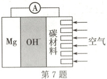 7.A 解析:该装置是原电池,Mg电极为原电池负极,碳材料电极为原电池正极。原电池将化学能转化为电能,A正确;原电池中正极得到电子发生还原反应,B错误;原电池工作时,外电路中电子由负极流向正极,则外电路中电子由Mg电极经导线流向碳材料电极,C错误;电解质溶液是碱性的,所以负极反应式为Mg−2e⁻+2OH⁻=Mg(OH)₂,D错误。