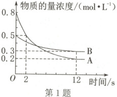 1.C 解析:图中两曲线相交之后,两种反应物的浓度继续减小,则反应未达到平衡,$v_{ 正}(A)>v_{ 逆}(A)$,A错误。D呈固态,不能用D的浓度变化表示平均反应速率,B错误。根据题给信息,可得出起始浓度:$c(A)=0.8\ mol· L^{-1}$、$c(B)=0.5\ mol· L^{-1}$,12 s时浓度:$c(A)=0.2\ mol· L^{-1}$、$c(B)=0.3\ mol· L^{-1}$、$c(C)=\frac{1.2\ mol}{3\ L}=0.4\ mol· L^{-1}$,则可建立如下三段式: