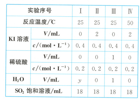 (3)①为了保证实验Ⅰ和实验Ⅱ中$SO_2$的浓度相同,混合溶液的体积应保持相等,故实验Ⅰ中需要加入2 mL水,即y的值为2。②由表中数据可知,实验Ⅳ必须选择,根据控制变量的原则,其他影响反应速率的因素应保持一致,因此应选择实验Ⅱ和实验Ⅳ。③实验Ⅰ和实验Ⅲ的不同之处在于实验Ⅲ中加入了稀硫酸,因此利用实验Ⅰ和实验Ⅲ可探究稀硫酸用量对反应速率是否有影响。