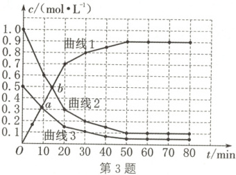 (2)①$SO_2$和$O_2$是反应物,随着反应进行浓度逐渐减小,且相同时间内$SO_2$和$O_2$的浓度变化量之比为2:1,据此可知$SO_2$对应的曲线为曲线2,$O_2$对应的曲线为曲线3。②b点时,反应还未达到平衡,反应正向进行,故$O_2$的正反应速率大于$O_2$的逆反应速率。③设a点时,转化了$x\ mol· L^{-1}\ O_2$,列三段式如下: