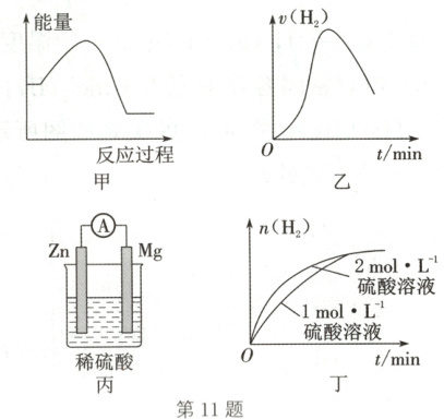 11.C 解析:Zn 与稀硫酸的反应为放热反应,反应物的总能量大于生成物的总能量,A 正确;Zn 与稀硫酸反应放热,开始一段时间,体系温度是影响反应速率的主要因素,温度升高使得生成 H₂ 的速率增大,后来 H⁺ 浓度是影响反应速率的主要因素,H⁺ 浓度减小使得生成 H₂ 的速率减小,B 正确;Mg 比 Zn 活泼,Mg 为负极,Zn 为正极,电池总反应为 Mg + H₂SO₄ = MgSO₄ + H₂↑,不是 Zn + H₂SO₄ = ZnSO₄ + H₂↑,C 错误;2 mol·L⁻¹ H₂SO₄ 溶液中 H⁺ 的浓度大于 1 mol·L⁻¹ H₂SO₄ 溶液中 H⁺ 的浓度,Zn 与 2 mol·L⁻¹ H₂SO₄ 溶液反应的速率比与 1 mol·L⁻¹ H₂SO₄ 溶液反应的速率大,由于参与反应的锌粒等量,最终产生 H₂ 的物质的量相等,D 正确。