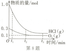 8. (2025·福建福州期中)在$2.0\ \mathrm{L}$恒温、恒容密闭容器中充入$1.0\ \mathrm{mol}\ \mathrm{HCl}$和$0.3\ \mathrm{mol}\ \mathrm{O}_{2}$,加入催化剂,发生反应:$4\mathrm{HCl(g) + O_{2}(g)\ \rightleftharpoons \ 2Cl_{2}(g) + 2H_{2}O(g)}$,$\mathrm{HCl}$、$\mathrm{O}_{2}$的物质的量随时间的变化曲线如图所示。