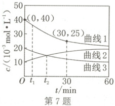 7.D 解析:由于反应物浓度逐渐减小,而生成物浓度逐渐增大,且物质浓度变化量之比等于化学计量数之比,由此可知,曲线 3 代表反应物 CO 的浓度变化,曲线 1 代表反应物 H₂ 的浓度变化,曲线 2 代表生成物 CH₃OH 的浓度变化,A 错误;t₂ min 时两物质的浓度相等,但是之后浓度仍在变化,此时反应没有达到平衡,B 错误;升高温度,正反应速率增大,逆反应速率也增大,C 错误;0~30 min 内用 CH₃OH 表示的平均反应速率$ v(CH₃OH) = \frac{1}{2}v(H₂) = \frac{1}{2} × \frac{40×10⁻³ - 25×10⁻³}{30} mol·L⁻¹·min⁻¹ = 2.5×10⁻⁴ mol·L⁻¹·min⁻¹,$D 正确。