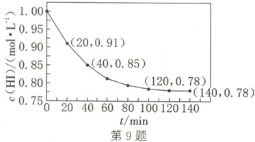 9.D 解析:由图可知,20 min 时,HI 的转化率为$ \frac{(1.00 - 0.91)mol·L⁻¹}{1.00 mol·L⁻¹} × 100% = 9%,$A 错误;120 min 时达到平衡状态,则 v_正(HI) = 2v_逆(I₂),B 错误;加入高效催化剂,化学反应速率增大,达到平衡时 t < 120 min,C 错误;0~40 min 内,$v(HI) = \frac{(1.00 - 0.85)mol·L⁻¹}{40 min} = 0.00375 mol·L⁻¹·min⁻¹,$则$ v(H₂) = \frac{1}{2} × 0.00375 mol·L⁻¹·min⁻¹ = 1.875×10⁻³ mol·L⁻¹·min⁻¹,$D 正确。