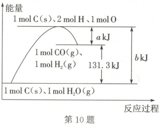 10.C 解析:由题图可知,该反应为吸热反应,化学方程式为 C(s) + H₂O(g) = CO(g) + H₂(g),能量增加 (b - a)kJ/mol,A 项正确;该反应过程中反应物断键吸收的能量大于生成物成键放出的能量,B 项正确;由题图可知,1 mol C(s)和 1 mol H₂O(g)反应生成 1 mol CO(g)和 1 mol H₂(g)吸收的能量为 131.3 kJ,而 1 mol H₂O(l)变为 1 mol H₂O(g)时要吸收能量,因此 1 mol C(s)和 1 mol H₂O(l)反应生成 1 mol CO(g)和 1 mol H₂(g)吸收的能量大于 131.3 kJ,C 项错误;由题图可知,1 mol C(s)、2 mol H、1 mol O 转变成 1 mol CO(g)和 1 mol H₂(g)放出的能量为 a kJ,D 项正确。