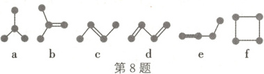 8. B解析:d和c的分子式不同,不互为同分异构体,A错误;b、c、f的分子式均为$\mathrm{C}_{4} \mathrm{H}_{8}$,互为同分异构体,B正确;f为环状烃,C错误;同种物质中可能同时含有碳链和碳环,D错误。