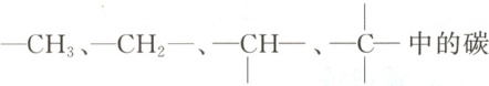 —$ CH_{3}$、—$ CH_{2}$—、 、 中的碳原子,分别称为伯、仲、叔、季碳原子,数目分别用$n_{1}$、$n_{2}$、$n_{3}$、$n_{4}$表示。例如: