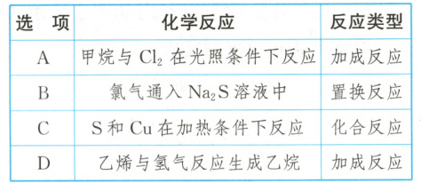 4.A 解析:甲烷与$Cl_{2}$在光照条件下的反应是取代反应,A错误;氯气通入$Na_{2}S$溶液中生成硫单质,是置换反应,B正确;S和Cu在加热条件下反应生成硫化亚铜,是化合反应,C正确;乙烯与氢气反应生成乙烷,是加成反应,D正确。