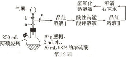 12. (2024·山东青岛期末)探究浓硫酸与蔗糖反应及产物性质的实验设计如图。反应开始时,打开 a、b,关闭 c;当反应停止后,关闭 a,打开 c,挤压气囊进行实验。下列说法错误的是 (