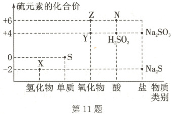 11.D 解析:X为硫的-2价氢化物,则X为H₂S,Y为硫的+4价氧化物,则Y为SO₂,Z为硫的+6价氧化物,则Z为SO₃,N为硫的+6价酸,则N为H₂SO₄。SO₂不能漂白酸碱指示剂,将SO₂通入紫色石蕊溶液中,溶液变红,不会褪色,A错误;S与O₂反应生成SO₂,SO₂与O₂反应生成SO₃,S单质不能通过一步反应直接转化为SO₃,C错误;浓硫酸具有强氧化性和脱水性,可以使蔗糖变黑,碳和浓硫酸反应会产生有刺激性气味的气体,D正确。