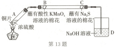 (4)用水或稀硫酸作吸收剂时容易形成酸雾,吸收速率小,不利于吸收SO₃ 解析:由实验装置图可知,装置A中铜和浓硫酸共热反应生成硫酸铜、二氧化硫和水,B处蘸有酸性KMnO₄溶液的棉花用于验证二氧化硫的还原性,C处蘸有Na₂S溶液的棉花用于验证二氧化硫的弱氧化性,装置D中盛有的NaOH溶液用于吸收未反应的二氧化硫,防止污染空气。