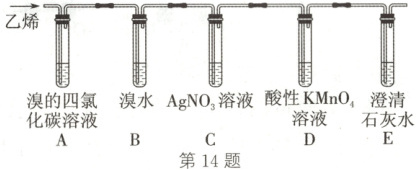 14. (2024·甘肃兰州期末)将石蜡油分解产生的乙烯通入下列各试管中,装置如图所示。