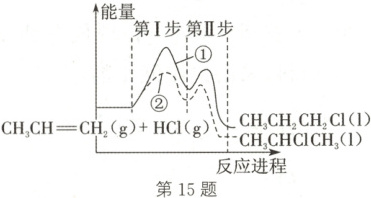 15.B 解析:反应①②均为$CH_{3}CH=CH_{2}$与HCl的加成反应,A正确。反应①的第Ⅰ步中反应物总能量低于生成物总能量,吸收能量;第Ⅱ步中反应物总能量高于生成物总能量,放出能量,B错误。由题图可知,$CH_{3}CHClCH_{3}$的总能量低于$CH_{3}CH_{2}CH_{2}Cl$,能量越低越稳定,则$CH_{3}CHClCH_{3}$比$CH_{3}CH_{2}CH_{2}Cl$稳定,C正确。$CH_{3}CH_{2}CH_{2}Cl$与$CH_{3}CHClCH_{3}$的分子式相同,结构不同,两者互为同分异构体,D正确。