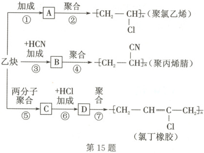15. 如图是以乙炔(结构简式为CH≡CH)为主要原料合成聚氯乙烯、聚丙烯腈和氯丁橡胶的转化关系图(反应条件已略去)。
