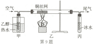9.B 解析:在乙醇的催化氧化反应中,铜作催化剂,发生反应:2Cu+O₂$\overset{△}{⇌}$2CuO(铜丝变黑)、CH₃CH₂OH+CuO$\overset{△}{\longrightarrow}$CH₃CHO+Cu+H₂O(铜丝变红),所以硬质玻璃管中铜丝网可能会出现黑色、红色互变现象,A正确;Cu与氧气反应生成CuO,CuO与乙醇反应生成Cu,反应前后Cu的化学性质和质量不变,所以Cu是催化剂,但是Cu参加了反应,B错误;装置甲中水浴加热的目的是促进乙醇挥发,改用酒精灯直接加热可以达到同样的效果,C正确;乙醇催化氧化生成乙醛和水,冰水可以冷却气体,使乙醛、未反应完的乙醇和生成的水冷凝为液态,便于收集,D正确。