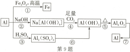 9.C 解析:反应①:$3Fe_3O_4 + 8Al\xlongequal{高温}9Fe + 4Al_2O_3$,该反应放热,常用于焊接铁轨,A正确;反应②③都能产生氢气,反应的关系式都是$2Al~3H_2~6e^-$,因此产生等量氢气消耗$Al$的质量相等且转移电子数相等,B正确;向$Al_2(SO_4)_3$溶液中滴加足量的$NaOH$溶液可能使生成的$Al(OH)_3$溶解,可以向$Al_2(SO_4)_3$溶液中滴加足量的氨水制备$Al(OH)_3$,C错误;工业上常用反应⑦制备金属铝:$2Al_2O_3$(熔融)$\xlongequal{电解冰晶石}4Al + 3O_2\uparrow$,D正确。