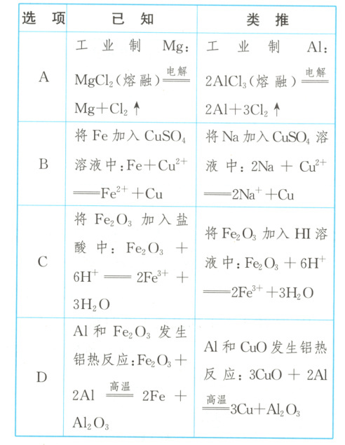 6.D 解析:工业上电解熔融氧化铝制取金属铝,A错误;将$Na$加入$CuSO_4$溶液中,$Na$先和水反应生成$NaOH$,$NaOH$再和硫酸铜反应生成$Cu(OH)_2$沉淀,B错误;将$Fe_2O_3$加入$HI$溶液中:$Fe_2O_3 + 2I^- + 6H^+=2Fe^{2+} + I_2 + 3H_2O$,C错误;$Al$和$Fe_2O_3$发生铝热反应:$Fe_2O_3 + 2Al\xlongequal{高温}2Fe + Al_2O_3$,同样$Al$和$CuO$发生铝热反应:$3CuO + 2Al\xlongequal{高温}3Cu + Al_2O_3$,类推合理,D正确。
