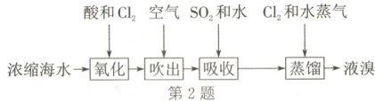 2.A 解析:向浓缩海水中通入 $\mathrm{Cl_2}$ 将 $\mathrm{Br^-}$ 氧化为 $\mathrm{Br_2}$,使用空气将溴吹出后,用 $\mathrm{SO_2}$ 吸收溴单质并将其转化为 $\mathrm{HBr}$,再通入氯气将 $\mathrm{HBr}$ 氧化为 $\mathrm{Br_2}$,利用物质沸点的不同,采取蒸馏的方法将溴蒸出。“氧化”过程中通入 $\mathrm{Cl_2}$ 的目的是将溴离子氧化为 $\mathrm{Br_2}$,A 正确;“吹出”过程中通入空气的目的是将溴吹出,B 错误;吹出的溴单质被 $\mathrm{SO_2}$ 吸收生成 $\mathrm{HBr}$,反应的化学方程式为 $\mathrm{SO_2} + \mathrm{Br_2} + 2\mathrm{H_2O} \longrightarrow \mathrm{H_2SO_4} + 2\mathrm{HBr}$,其中 $\mathrm{SO_2}$ 被氧化,作还原剂,体现还原性,C 错误;“蒸馏”过程中通入 $\mathrm{Cl_2}$ 的目的是将 $\mathrm{HBr}$ 氧化为 $\mathrm{Br_2}$,D 错误。