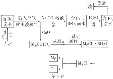 4.C 解析:反应①中 $\mathrm{Cl_2}$ 将卤水中 $\mathrm{Br^-}$ 氧化成 $\mathrm{Br_2}$,鼓入空气吹出溴蒸气,用 $\mathrm{Na_2CO_3}$ 溶液吸收溴蒸气得到含 $\mathrm{Br^-}$、$\mathrm{BrO_3^-}$ 卤水,加入 $\mathrm{H_2SO_4}$,$\mathrm{Br^-}$、$\mathrm{BrO_3^-}$ 发生归中反应生成 $\mathrm{Br_2}$,所得含 $\mathrm{Br_2}$ 卤水已将溴元素富集,故反应③所得含 $\mathrm{Br_2}$ 卤水浓度>反应①所得含 $\mathrm{Br_2}$ 卤水浓度,A 正确;反应②为 $3\mathrm{Br_2} + 3\mathrm{Na_2CO_3} \longrightarrow 5\mathrm{NaBr} + \mathrm{NaBrO_3} + 3\mathrm{CO_2}$,反应中部分 $\mathrm{Br}$ 元素的化合价由 0 升至+5,部分由 0 降至-1,由化学方程式可知,每吸收 3 mol $\mathrm{Br_2}$ 转移 5 mol 电子,B 正确;$\mathrm{Mg(OH)_2}$ 的煅烧产物为 $\mathrm{MgO}$,$\mathrm{MgO}$ 的熔点远高于 $\mathrm{MgCl_2}$,故电解熔融 $\mathrm{MgCl_2}$ 制取 $\mathrm{Mg}$ 单质更好,C 错误;试剂 a 用于将 $\mathrm{Mg(OH)_2}$ 溶解,经一系列操作后得到 $\mathrm{MgCl_2} · 6\mathrm{H_2O}$,故试剂 a 可以为盐酸,D 正确。