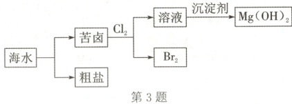 3. (2024·安徽黄山期末)海水资源非常丰富,具有巨大的开发潜力。海水的综合利用示意图如图所示,其中苦卤中主要含$ K^+$、$ Mg^{2+}$、$ Br^-$等离子。下列说法正确的是 (