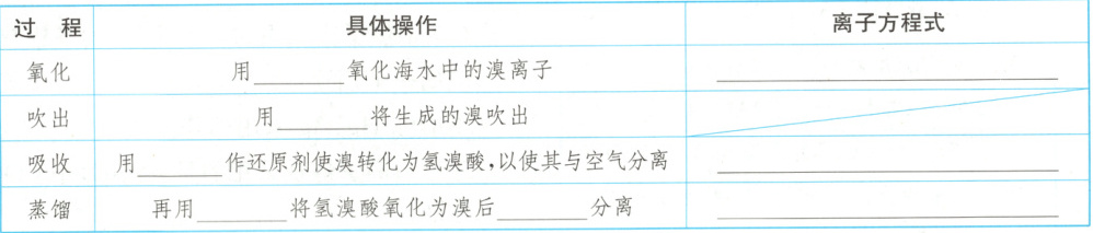 1.蒸馏 反渗透 电渗析 2.(从左到右,从上到下)氯气 $\mathrm{Cl_2} + 2\mathrm{Br^-} \longrightarrow 2\mathrm{Cl^-} + \mathrm{Br_2}$ 空气 二氧化硫 $\mathrm{SO_2} + \mathrm{Br_2} + 2\mathrm{H_2O} \longrightarrow 4\mathrm{H^+} + 2\mathrm{Br^-} + \mathrm{SO_4^{2-}}$ 氯气 蒸馏 $\mathrm{Cl_2} + 2\mathrm{Br^-} \longrightarrow 2\mathrm{Cl^-} + \mathrm{Br_2}$
