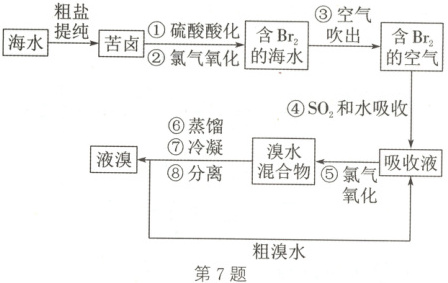 7.D 解析:$\mathrm{Na_2SO_3}$ 也可以被溴氧化,故步骤④中可用亚硫酸钠溶液代替 $\mathrm{SO_2}$ 和水,A 正确;步骤②发生反应:$\mathrm{Cl_2} + 2\mathrm{Br^-} \longrightarrow 2\mathrm{Cl^-} + \mathrm{Br_2}$,故氧化 0.3 mol $\mathrm{Br^-}$,理论上消耗 0.15 mol 氯气,体积为 3.36 L(标准状况),B 正确;可用空气吹出 $\mathrm{Br_2}$,则步骤③说明 $\mathrm{Br_2}$ 具有挥发性,C 正确;步骤②发生反应:$\mathrm{Cl_2} + 2\mathrm{Br^-} \longrightarrow 2\mathrm{Cl^-} + \mathrm{Br_2}$,说明还原性:$\mathrm{Br^-} > \mathrm{Cl^-}$,步骤④发生反应:$\mathrm{SO_2} + \mathrm{Br_2} + 2\mathrm{H_2O} \longrightarrow \mathrm{SO_4^{2-}} + 2\mathrm{Br^-} + 4\mathrm{H^+}$,说明还原性:$\mathrm{SO_2} > \mathrm{Br^-}$,D 错误。