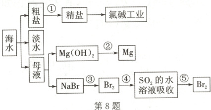 8.B 解析:从海水晒制粗盐过程中没有化学反应发生(无复分解反应),A 项错误;单质镁是通过电解熔融 $\mathrm{MgCl_2}$ 的方法制取的,B 项正确;④中溴元素被还原,C 项错误;蒸馏法会消耗大量的能源,不是最具有发展前景的海水淡化方法,D 项错误。