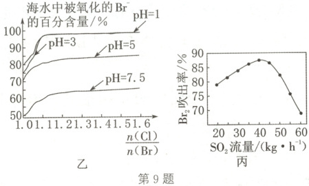 9.(1)避免 $\mathrm{Cl_2}$ 与碱性海水反应(或酸性条件下 $\mathrm{Cl_2}$ 的氧化性增强) (2)$\mathrm{pH} = 3$、$\frac{n(\mathrm{Cl})}{n(\mathrm{Br})}=1.1$(或≈1.1) (3)过量的 $\mathrm{SO_2}$ 随吸收 $\mathrm{Br_2}$ 后的空气进入“吹出塔”,与 $\mathrm{Br_2}$ 反应,使 $\mathrm{Br_2}$ 吹出率下降 (4)B (5)$\mathrm{HCl}$、$\mathrm{H_2SO_4}$ (6)0.8 解析:由题给流程可知,向酸化的浓缩海水中通入氯气,将溶液中的溴离子氧化为溴,用空气将溴吹出,吹出的溴与二氧化硫和水反应生成氢溴酸和硫酸,向酸溶液中通入氯气,将氢溴酸氧化为溴,蒸馏得到液溴和可以循环使用的盐酸、硫酸混合溶液。(2)从图乙中可以看出,在 $\mathrm{pH} = 3$、$\frac{n(\mathrm{Cl})}{n(\mathrm{Br})}=1.1$(或≈1.1)时海水中被氧化的 $\mathrm{Br^-}$ 的百分含量已经很高,再减小 $\mathrm{pH}$ 或加大氯的量,对海水中被氧化的 $\mathrm{Br^-}$ 的百分含量的提高也几乎没有影响,所以“氧化”适宜的条件为 $\mathrm{pH} = 3$、$\frac{n(\mathrm{Cl})}{n(\mathrm{Br})}=1.1$(或≈1.1)。(4)由溴单质的沸点为 58.8℃可知,“蒸馏塔”中温度应控制在 58.8℃以上,但不能高于水的沸点。(6)根据最终得到 38.4 g $\mathrm{Br_2}$,$n(\mathrm{Br_2}) = \frac{38.4 \mathrm{g}}{160 \mathrm{g} · \mathrm{mol}^{-1}} = 0.24 \mathrm{mol}$,总提取率为 60%可知,原海水中溴离子的物质的量为 $\frac{0.24 \mathrm{mol} × 2}{60\%} = 0.8 \mathrm{mol}$,海水的体积为 $1 \mathrm{m^3} = 1000 \mathrm{L}$,则溴离子的浓度为 $\frac{800 \mathrm{mmol}}{1000 \mathrm{L}} = 0.8 \mathrm{mmol} · \mathrm{L}^{-1}$。