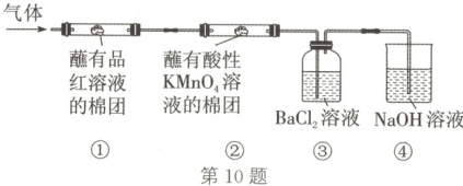 10.C 解析:SO₂可使品红溶液褪色,①中棉团颜色褪去,A正确;酸性KMnO₄溶液具有氧化性,能氧化SO₂,②中棉团颜色褪去,体现了SO₂的还原性,B正确;将生成的气体通入BaCl₂溶液中发生反应:SO₃ + H₂O=\!=\!=H₂SO₄、H₂SO₄ + BaCl₂=\!=\!=BaSO₄↓ + 2HCl,由于H₂SO₃的酸性弱于HCl和H₂SO₄,因此SO₂不能与BaCl₂反应,故无BaSO₃生成,C错误;④为吸收尾气(含SO₂)的装置,可发生反应:SO₂ + 2NaOH=\!=\!=Na₂SO₃ + H₂O,D正确。