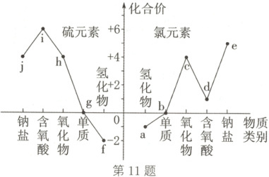 11.C 解析:i为硫酸,j为亚硫酸钠(或亚硫酸氢钠),二者发生非氧化还原反应,A错误;d为次氯酸,h为二氧化硫,二者的水溶液在空气中久置,HClO见光分解生成HCl,SO₂的水溶液在空气中久置被氧化生成硫酸,则溶液的酸性均增强,B错误;a为氯化氢,e为氯酸钠,b为氯气,氯化氢和氯酸钠反应生成氯气的离子方程式为5Cl⁻ + 6H⁺ + ClO₃⁻=\!=\!=3Cl₂↑ + 3H₂O,C正确;b为氯气,g为硫单质,铁和氯气反应生成FeCl₃,铁和硫反应生成FeS,产物中铁元素的化合价分别为+3、+2,化合价不相同,D错误。