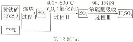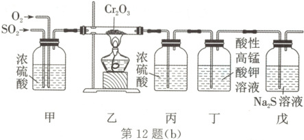 $12.(1)-1 4FeS₂ + 11O₂\stackrel{点燃}{=\!=\!=}2Fe₂O₃ + 8SO₂ (2)①$干燥气体、混合气体、通过观察气泡调节气体混合比例 ②吸收SO₃ ③5SO₂ + 2MnO₄⁻ + 2H₂O=\!=\!=5SO₄²⁻ + 2Mn²⁺ + 4H⁺ 解析: