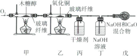 16. 兴趣小组用如图所示装置测定木糖醇中碳、氢、氧元素的质量比。取$1.52 g$木糖醇置于装置甲反应管中,充分反应后,测得丙装置增重$1.08 g$,丁装置增重$2.20 g$(实验前已排尽装置内空气,装置乙、丙、丁、戊内试剂均足量)。下列说法错误的是(