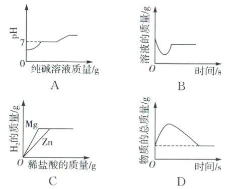 15 CD [解析]向一定量的盐酸和氯化钙的混合溶液中逐滴加入纯碱溶液时,纯碱先与盐酸反应生成氯化钠、水和二氧化碳,随着盐酸消耗,酸性减弱,pH升高,恰好完全反应时pH=7,盐酸反应完毕,碳酸钠再和氯化钙反应生成碳酸钙沉淀和氯化钠,过程中pH不变,氯化钙完全反应后,继续加入碳酸钠溶液,碳酸钠溶液显碱性,则溶液pH升高,A正确;向一定量的氢氧化钙饱和溶液中加入少量氧化钙固体时,氧化钙和水反应生成氢氧化钙,溶剂质量减小,反应过程中放出热量,溶液温度升高,氢氧化钙溶解度随着温度升高而减小,导致溶液中溶质质量减小,则溶液质量减小,完全反应后,温度降低回到室温,氢氧化钙溶解度增大,部分氢氧化钙溶于水,溶液质量增大,由于部分溶剂与氧化钙反应被消耗,溶剂质量减少,最终溶液质量小于原溶液质量,B正确;反应生成的氢气来自盐酸,当反应的盐酸质量相等时,生成氢气质量相等,而当等质量的镁和锌与足量的盐酸完全反应后,镁反应生成的氢气较多,C错误;一定质量的铜粉在充满氧气的密闭容器中加热,铜和氧气反应生成氧化铜,根据质量守恒定律总质量始终不变,D错误。