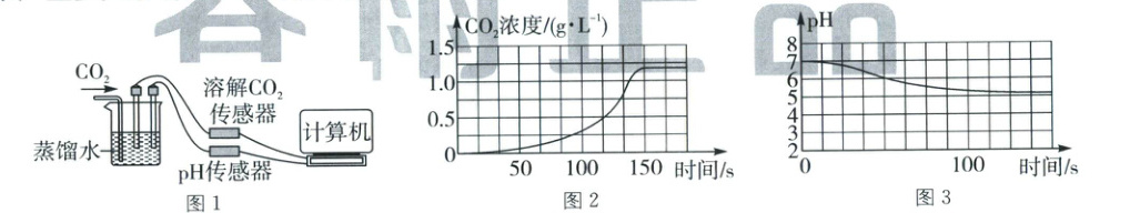 二氧化碳能溶于水且部分与水发生反应。地球表面 70%以上的区域被水覆盖,二氧化碳能对自然界的水产生多大影响呢?小亮借助数字化技术对此进行了定量探究(图 1),收集数据如图 2、图 3 所示。