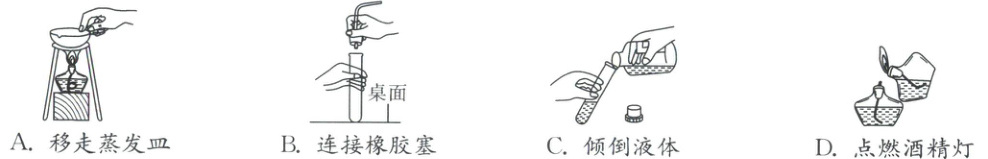 2.C [解析]移走蒸发皿应用坩埚钳,不能用手直接拿,防止烫伤,A错误;连接橡胶塞时,不能将试管放在桌面上用力塞橡胶塞,以免压破试管,B错误;倾倒液体时,取下的瓶塞应倒放在桌面上,应将试管略微倾斜,试管口紧挨着试剂瓶瓶口,试剂瓶上的标签朝向手心,C正确;不能用燃着的酒精灯去点燃另一个酒精灯,以免引起火灾,D错误。