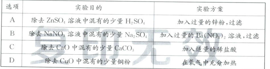 12.AD [解析]锌粉能与稀硫酸反应生成硫酸锌和氢气,加入过量锌粉,可将硫酸完全反应,过滤后能得到纯净的ZnSO₄溶液,A符合题意;Ba(NO₃)₂溶液能与Na₂SO₄反应生成硫酸钡沉淀和硝酸钠,但加入过量的Ba(NO₃)₂溶液,会引入新的杂质Ba(NO₃)₂,B不符合题意;CaO和CaCO₃都能与稀盐酸反应,CaO与稀盐酸反应生成氯化钙和水,CaCO₃与稀盐酸反应生成氯化钙、水和二氧化碳,不能用稀盐酸除去CaO中混有的CaCO₃,C不符合题意;铜粉在氧气中充分加热会生成氧化铜,在氧气中充分加热能除去CuO中混有的少量铜粉,D符合题意。