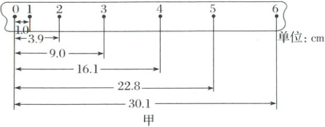 (1)由于相邻两计数点之间还有四个点未画出,所以题图甲中相邻两个计数点之间的时间间隔为0.1s,则$v_2 = \frac{0.09 - 0.01}{0.1 × 2} m/s = 0.40 m/s$,$v_4 = \frac{0.228 - 0.09}{0.1 × 2} m/s = 0.69 m/s$。