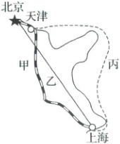 如图所示,某旅行者从北京到上海,他有三种出行方案:甲乘高铁直达;乙乘飞机直达;丙先乘汽车到天津,再换乘轮船到上海。三种方案的路程是否相同?位移是否相同?