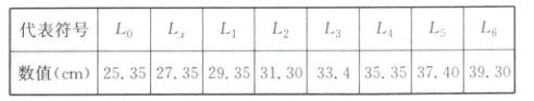 (2)弹簧自然悬挂,待弹簧静止时,长度记为$ L_0 $,弹簧下端挂上砝码盘时,长度记为$ L_x $;在砝码盘中每次增加10 g砝码,弹簧长度依次记为$ L_1 $至$ L_6 $,数据如下表: