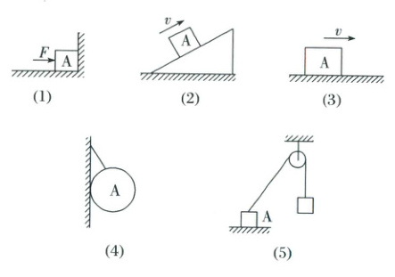 [针对训练] 3. 画出图中物体A所受力的示意图,并写出力的名称和施力物体:(1)物体A静止,接触面均光滑;(2)物体A沿固定粗糙斜面上滑;(3)物体A沿粗糙水平面滑行;(4)接触面光滑,物体A静止;(5)物体A静止在粗糙水平面上。