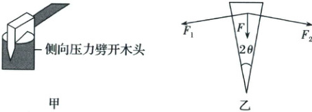 [例$2$] 在日常生活中,力的分解有着广泛的应用,如图甲用斧子把木桩劈开,已知两个侧面之间的夹角为$2\theta$,斧子对木桩施加一个向下的力$F$时,产生了大小相等的两个侧向分力$F_1$、$F_2$。由图乙可得,下列关系正确的是 (