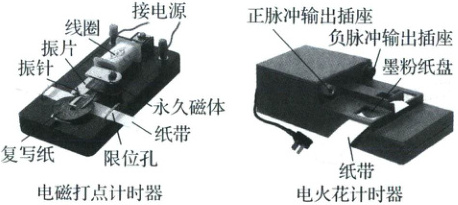 (2) 把打点计时器接到交流电源上 (电源频率为 $50 Hz$,电磁打点计时器接 $8 V$ 低压交流电源,电火花计时器接 $220 V$ 交流电源)。