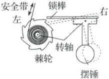 [例 6] 如图所示是一种汽车安全带控制装置示意图。当汽车处于静止状态或匀速直线运动状态时,刹车摆锤竖直悬挂,锁棒水平,棘轮可以自由转动,安全带能被拉动。当汽车突然刹车时,摆锤由于惯性绕轴摆动,使得锁棒锁定棘轮的转动,安全带不能被拉动。若摆锤从图中实线位置摆到虚线位置,汽车的可能运动方向和运动状态是 (