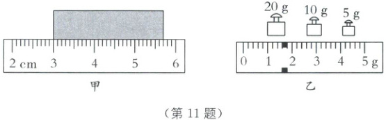 11.2.70 36.6 [解析]本题考查长度和质量的测量.由图甲可知,刻度尺1cm被分为10等份,分度值为0.1cm,被测物体左端与3cm刻度线对齐,右端与5.7cm刻度线对齐,读数时估读到分度值下一位,故物体长度为2.70cm;由图乙可知,天平标尺1g被分为5等份,则天平分度值为0.2g,物体质量$m = 20g + 10g + 5g + 1g + 3×0.2g = 36.6g$.