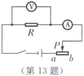 13. 如图所示,闭合开关,将滑片$P$向$b$端滑动,电压表示数