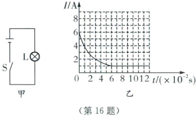 16. 将标有“6 V 6 W”的灯泡 L 接入电源电压恒为 6 V 的电路中,如图甲所示.闭合开关,利用传感装置绘出通过灯泡 L 的电流随时间变化的图像如图乙所示.闭合开关瞬间,灯泡的电功率为
